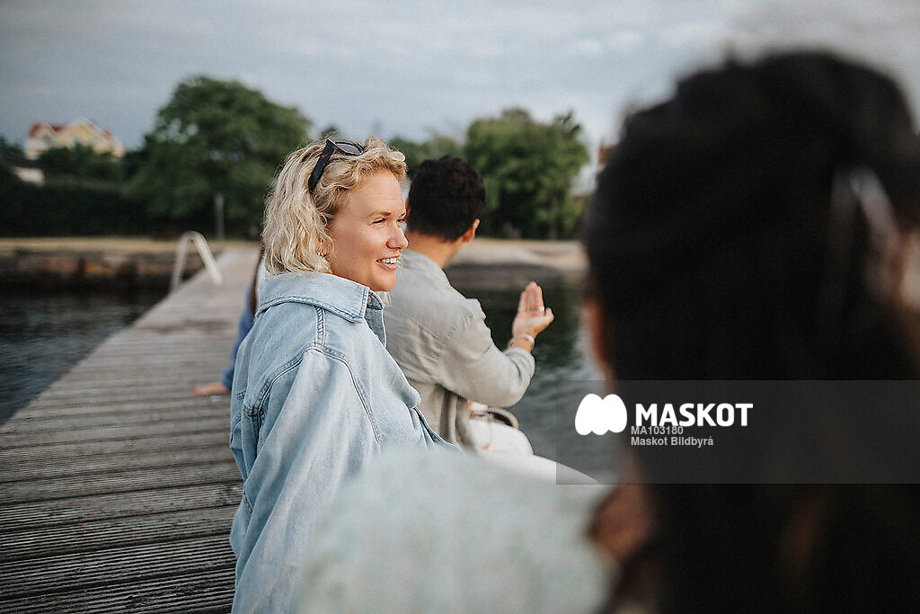 Leende kvinna umgås med kompisar på brygga