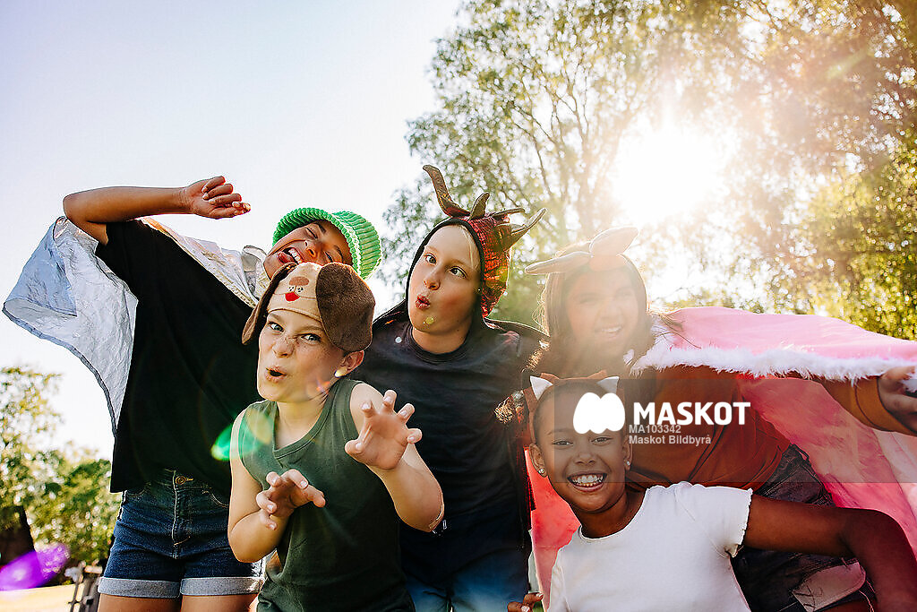 Porträtt av glada barn står utomhus med utklädnad