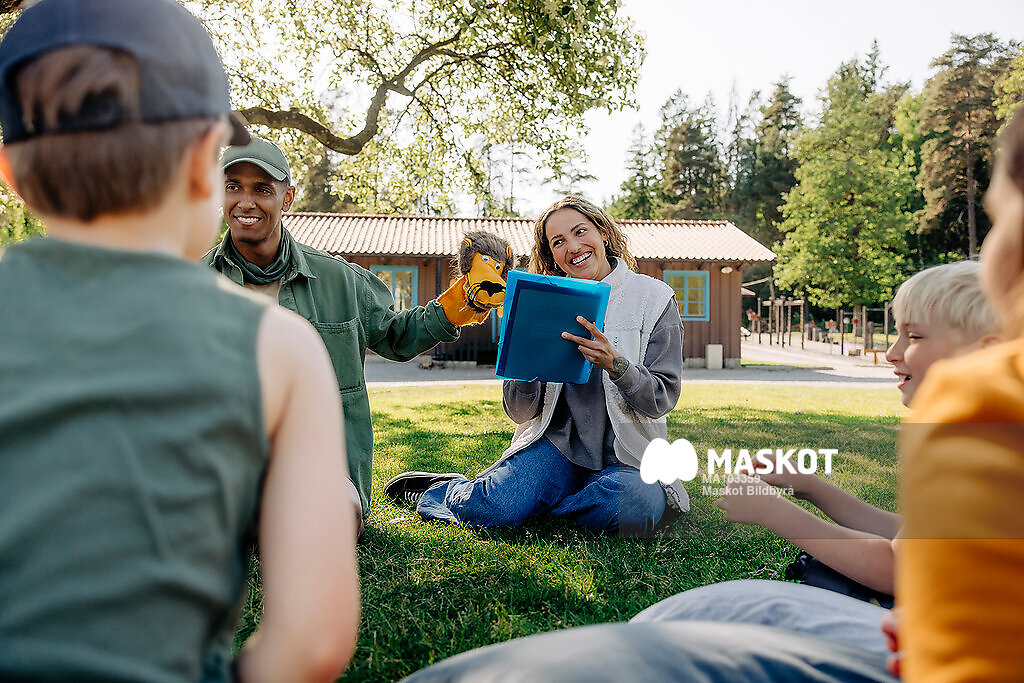 Glada lägerledare pratar med barn sittande på gräsmatta