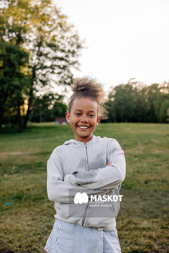 Porträtt av glad flicka stående med armarna i kors
