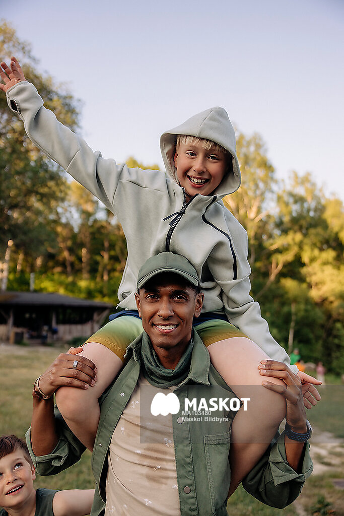 Porträtt av glad manlig lägerledare bärande pojke på axlarna