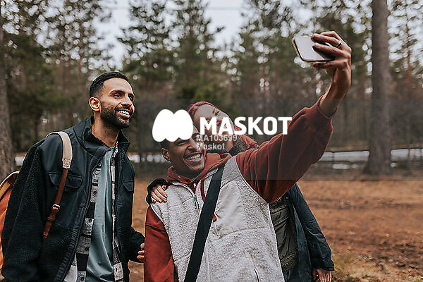 Glada vänner tar bild på sig själva stående i skog