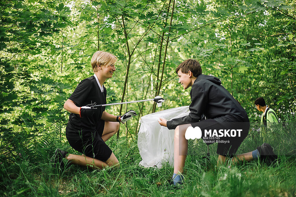 Glada pojkar tittar på varandra och samlar skräp i påse