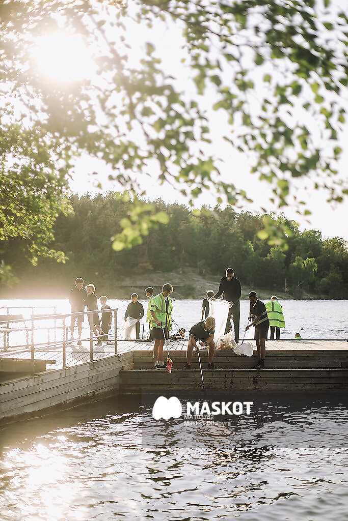 Unga killar står på brygga och letar skräp i vatten