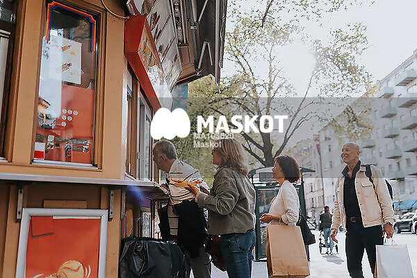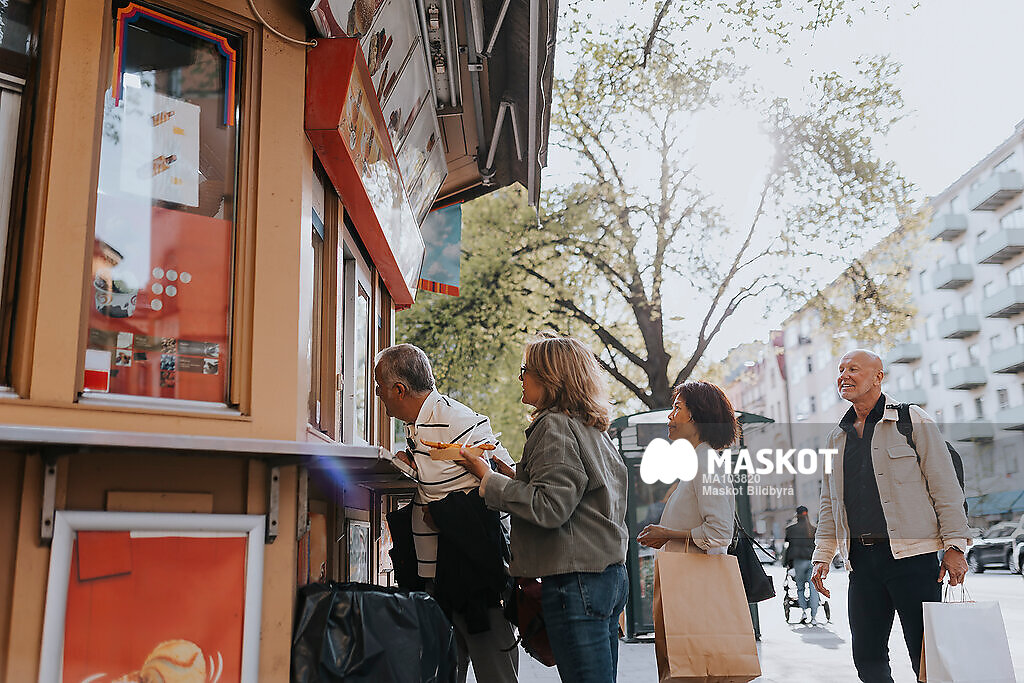 Äldre manliga och kvinnliga vänner beställer i kiosk