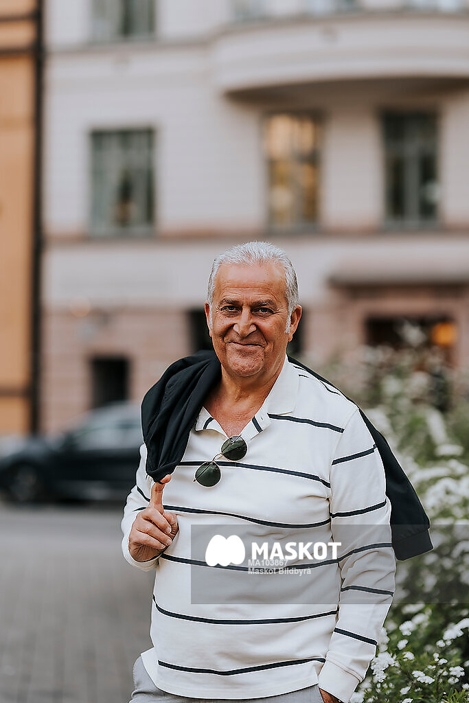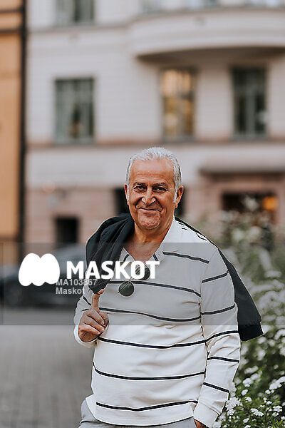 Porträtt av leende äldre man med jacka på axeln