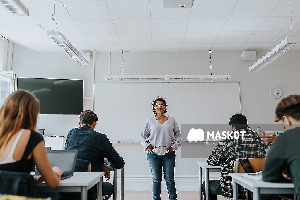 Porträtt av kvinnlig lärare stående med händer i fickan