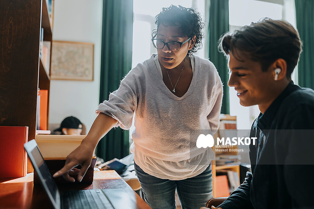 Kvinnlig lärare pekar på laptop och hjälper leende student