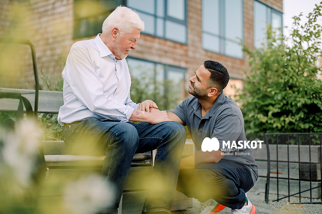 Manlig vårdpersonal pratar med äldre man sittande på bänk utomhus