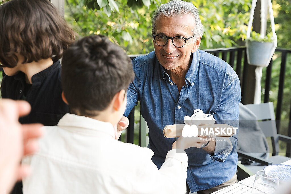 Leende äldre man ger present till pojke