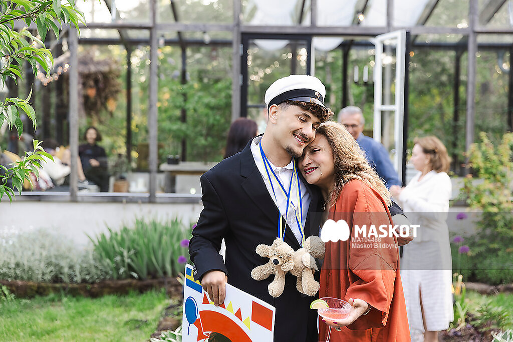 Glad ung man med studentmössa kramar kvinna