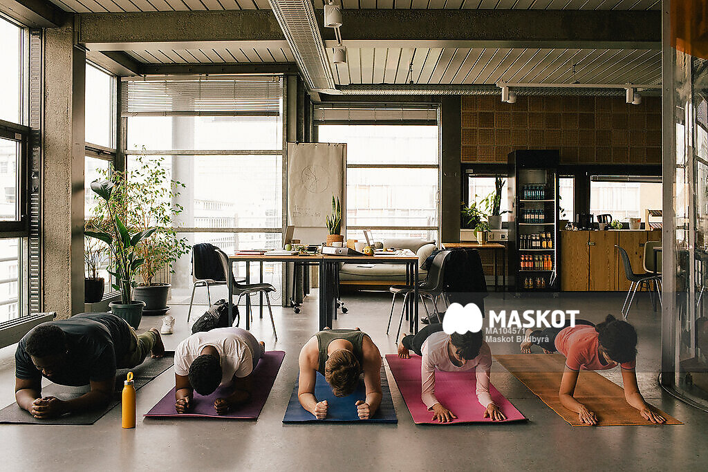 Manliga och kvinnliga kollegor gör yoga på kontor