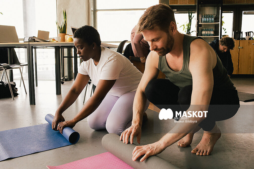 Manlig och kvinnlig kollega rullar ihop träningsmatta