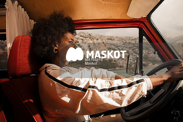 Fundersam kvinna kör bil på väg och kollar bort