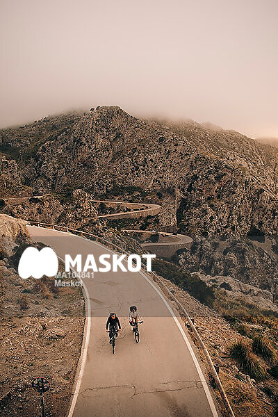 Man och kvinna cyklar på väg med berg i bakgrunden