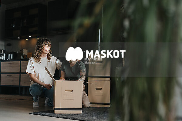Leende kvinnor packar upp flyttlåda i nytt hem