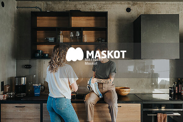 Leende kvinna sitter på diskbänk och torkar disk med partner