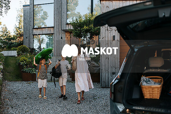 Glada söner och mamma på väg till elbil ståendes på uppfart