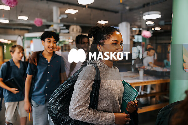 Leende tonårsflicka går med anteckningsblock i skolcafeteria