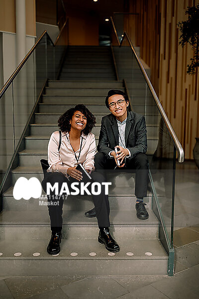 Porträtt av glad manlig och kvinnlig entreprenör sittandes i trappuppgång