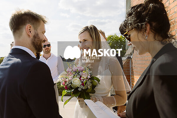 Glad man och kvinna kollar på varandra vid bröllopscermoni