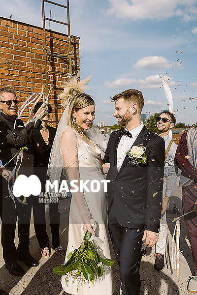 Brudpar kollar på varandra efter bröllopscermoni