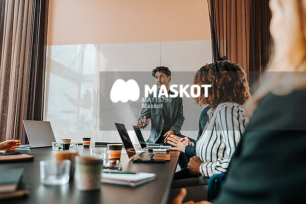 Ung affärsman diskuterar med kollegor under möte