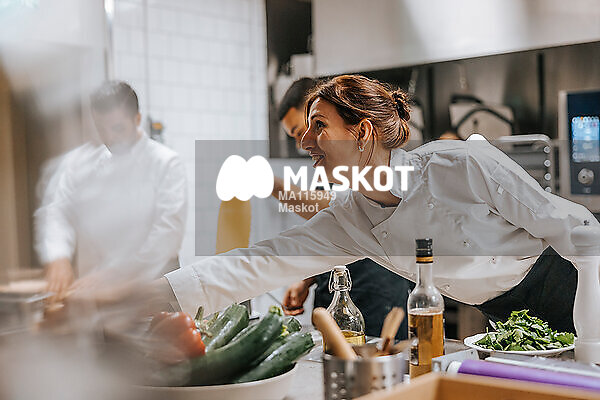 Glad kvinnlig kock sträcker sig efter råvara i kök