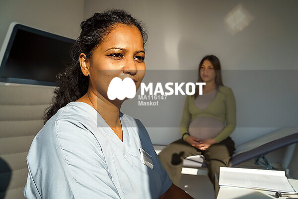 Kvinnlig förlossningsläkare undersöker gravid kvinna