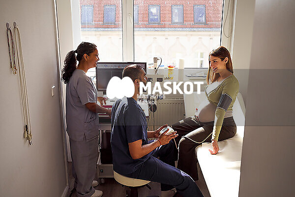 Manlig och kvinnlig läkare undersöker gravid kvinna