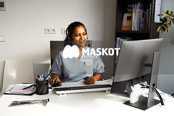 Kvinnlig läkare pratar med patient via videosamtal