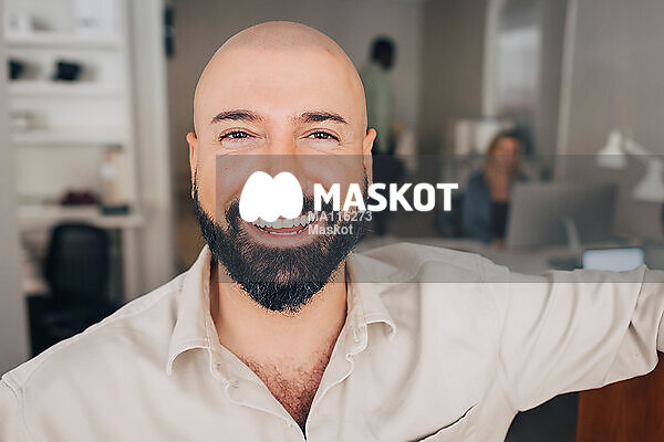 Porträtt av glad manlig entreprenör med skägg som står på kontor