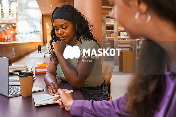 Kvinnliga studenter diskuterar uppgift i skolbibliotek