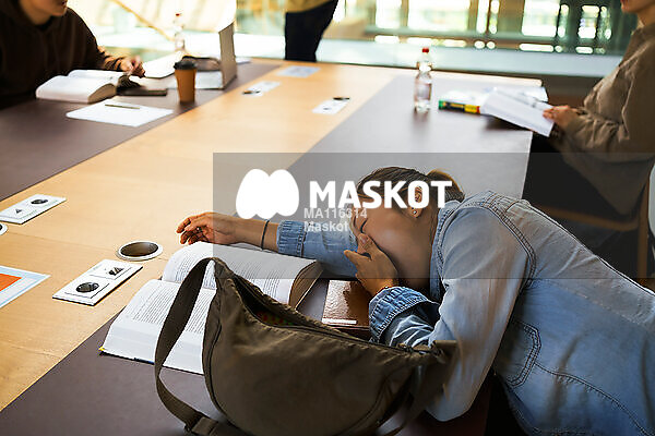 Trött ung kvinnlig student ligger på skrivbord i skolbibliotek