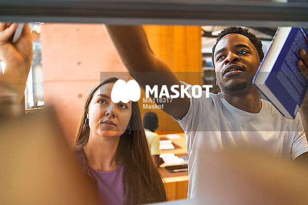 Manlig och kvinnlig student tar böcker från bokhylla i skolbibliotek