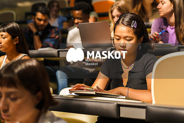 Ung kvinnlig student kollar på anteckningsblock under föreläsning på universitet