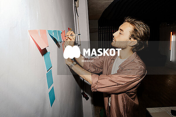 Manlig entreprenör skriver på lappar som sitter på vägg i kontor