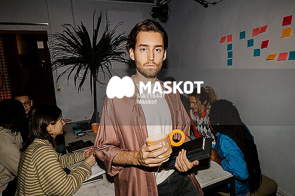 Porträtt av seriös manlig entreprenör som står lutad mot bord i kontor