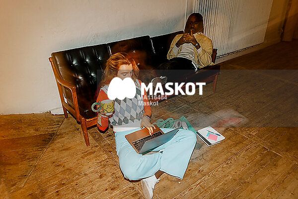 Manlig och kvinnlig entreprenör sitter vid soffa på kontor