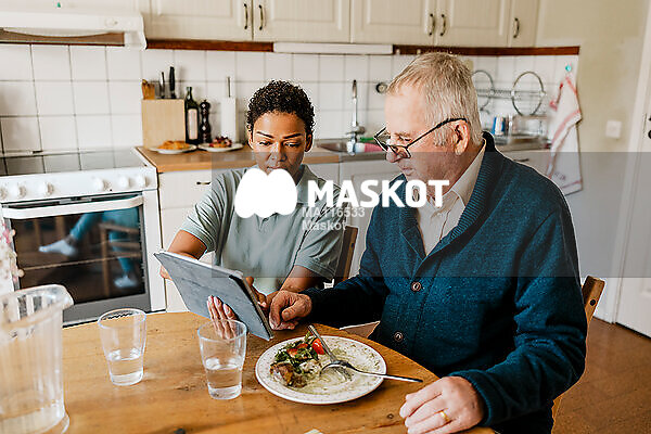 Kvinnlig vårddgivare visar surfplatta för äldre man