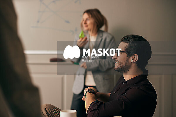 Glad ung affärsman med glasögon sitter på möte med kollegor