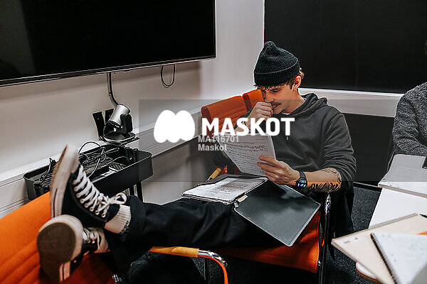 Ung man med mössa läser notskrift i pluggrum på universitet