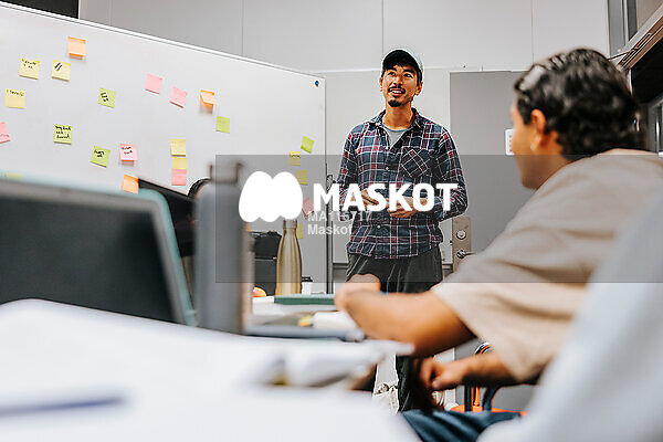 Leende ung diskuterar med vänner framför whiteboardtavla