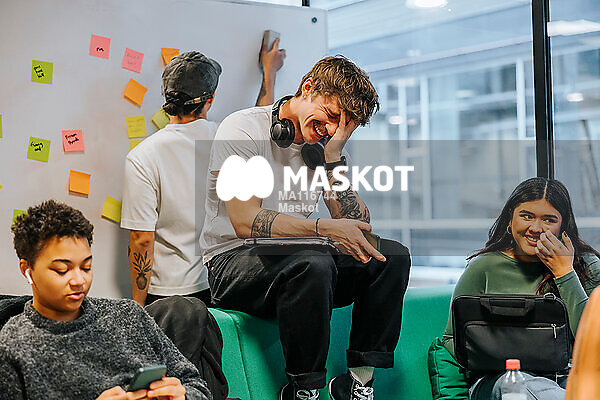 Glad ung man skrattar sittandes med vänner i universitet