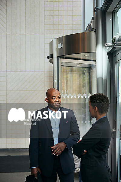 Affärsman pratar med kvinnlig kollega vid ingång av kontorsbyggnad