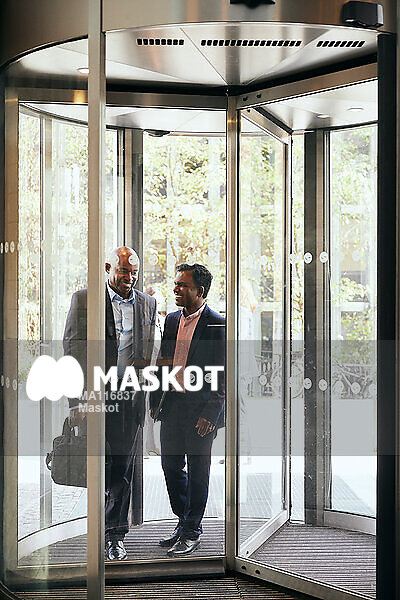 Glada affärsmän pratar i ingång till kontorsbyggnad