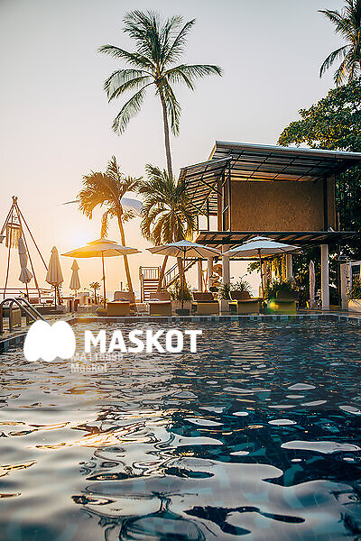 Pool på resort under solnedgång