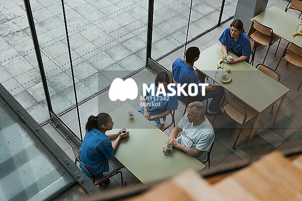 Manliga och kvinnliga läkare sitter i kafeteria på sjukhus