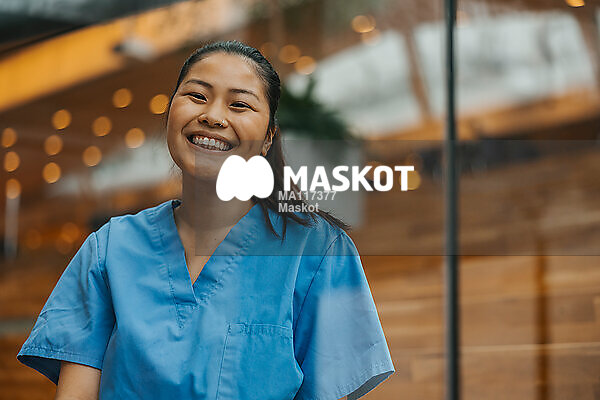 Porträtt av glad ung sjuksköterska som sitter i trappa på sjukhus