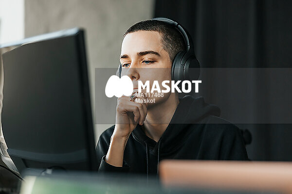 Koncentrerad programmerare med hörlurar sitter vid dator